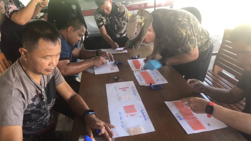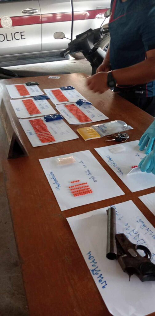 วันที่ 6 ธันวาคม 2567 เวลา 15.00น. นายนคร สายยืด นายอำเภอสูงเม่น จ.แพร่ได้สั่งการให้ พ.ต.อ.พงศ์พีระ การะเกตุ ผกก.สภ.สูงเม่น พ.ต.ท.ทัตเทพ โชติเดโชชัย รอง ผกก.สส.สภ.สูงเม่น จว.แพร่ นำกำลังเข้าตรวจค้นพื้นที่เป้าหมายพร้อมฝ่ายปกครอง โดยการนำของ นายหมวดเอกพนม สมนึก ปลัด อ.สูงเม่น และเจ้าหน้าที่ฝ่ายป้องกัน อ.สุงเม่น จ.แพร่ ฝ่ายปกครองในพื้นที่เข้าตรวจสอบตามสายรายงานบ้านเลขที่ 30/2 หมู่ที่ 2 ต.สูงเม่น อ.สูงเม่น จ.แพร่ จากการตรวจค้นเป้า หมาย พบนายอั้ฟ (นามสมมุติ) อายุ 33 ปี มีภูมิลำเนาใน ต.เวียงต้า อ.ลอง จ.แพร่ ทางเจ้าหน้าทีทุกฝ่ายได้กระจายการตรวจค้นภายในบริเวณรอบบ้านและในตัวบ้านพร้อมรถยนต์เก๋งยี่ห้อ มิตซูบิชิ ทะเบียน กจ.6939 น่าน จากการตรวจค้นตรวจค้นในจุดต่างๆที่ นายอั๊ฟ นำยาบ้าไปซุกซ่อนเก็บไว้ในสถานที่ต่างๆภายในบ้านหลังด้งกล่าว ผลการตรวจค้นจำนวน 1,078 เม็ด ซึ่งซุกซ่อนอยู่ในถุงพลาสติกโดยแบ่งแยกไว้เป็นถุงๆเพื่อพร้อมจะจำหน่ายให้กับเยาวชนและเป็นขาประจำในพื้นที่ที่มาซื้อยาบ้านำไปเสพ และยังพบปืนแบบไทยประดิษฐ์ ปืนลูกซองสั้น โดยไม่มีหมายเลขทะเบียนอีก 1 กระบอกพร้อมกระสุนปืนลูกซอง ขนาดเบอร์ 12 จำนวน 6 นัด