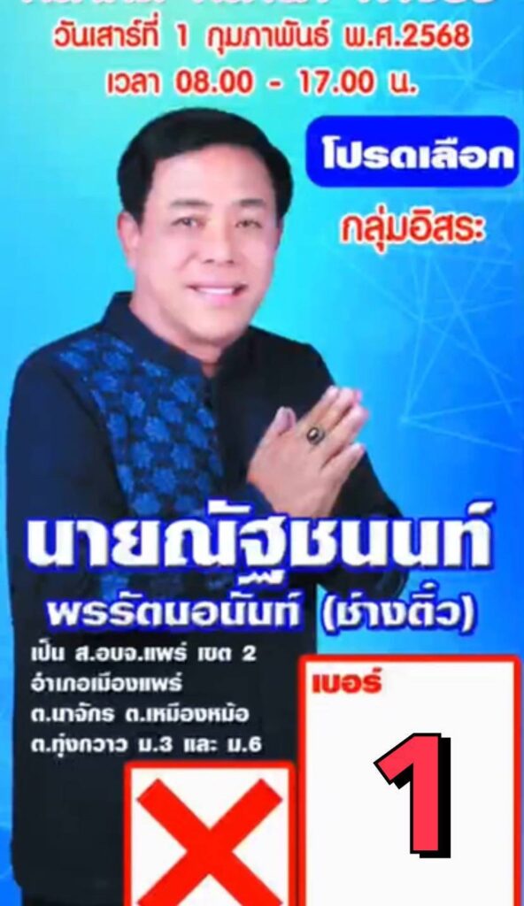 นายช่างติ๋ว จึงตัดสินใจลงรับสมัครกับการเลือกตั้ง ส.อบจ.แพร่ พ่อ-แม่ พี่ น้อง ในพื้นที่ ต.เหมืองหม้อ ต.ทุ่งกวาว หมู่ที่ 3 หมู่ที่ 6 และ ต.นาจักร เป็นผู้พิจารณาถึงตัวผู้บุคคลที่จะเป็นตัวแทนท่าน ในนาม ส.อบจ.แพร่ นายณัฐชนนท์ พรรัตนอนันต์ ( ช่างติ๋ว) พร้อมที่รับใช้ทุกท่านด้วยความเคารพและจริงใจ วันเสาร์ที่ 1 กุมภาพันธ์ 2568 ตั้งแต่ เวลา 08.00-17.00 น. ตามหน่วยเลือกตั้ง ทั้ง 3 ตำบล อ.เมืองแพร่ จ.แพร่………………………
