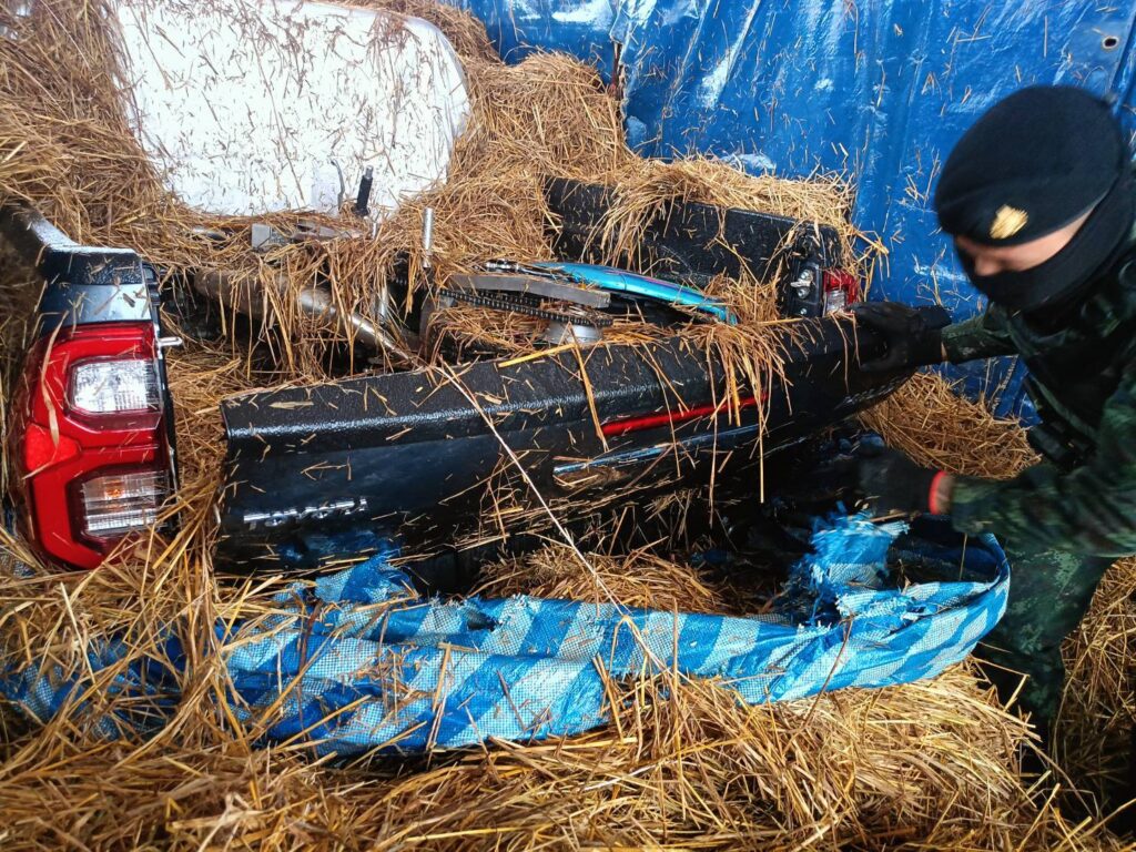 ทางเจ้าหน้าที่ฯ ให้นำรถบรรทุกให้ขับมาจอดที่ด่านชั่งน้ำหนักภูดู่ ( ร้าง) เพราะในช่วงเวลาดังกล่าวมีฝนตกหนัก จากการตรวจค้นและรื้อฝางอัดก้อนออก ผลปรากฏพบ รถยนต์ปิคอัพยี่ห้อ TOYOTA ( VIVO) 4 ประตู ยกสูง สีดำ ทะเบียนป้ายแดง 1734 พิษณุโลก และรถจักรยานยนต์ ยี่ห้อ KAVASAKI ( วิคเตอร์) สีฟ้ามีเล่มทะเบียน กมร.924 ทราบชื่อผู้ขับขีรถยนต์ ชื่อนายท้าวบุญนำ พรมมะแก้ว เป็นชาว สปป.ลาว เวลาต่อมามี นางสาว มณเฑียร เพ็ชรกลัด อยู่บ้านเลขที่ 292 หมู่ที่ 9 ต.วงฆ้องอ.พรหมพิราม จ.พิษณุโลก แสดงตัวตนว่าเป็นเจ้าของรถยนต์และรถจักรยานยนต์ ดังกล่าว โดยให้การว่ารถทั้ง 2 คัน มีเพื่อนเป็น ชาว สปป.ลาว