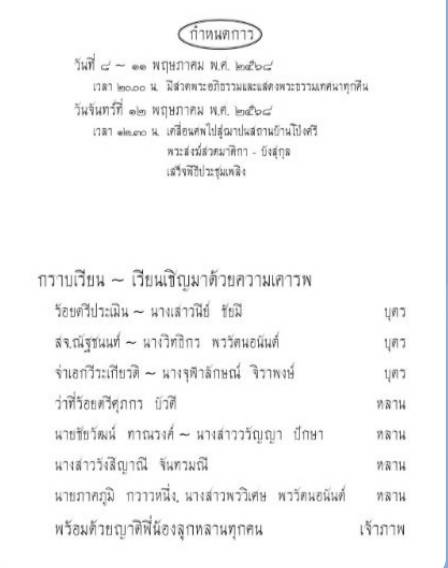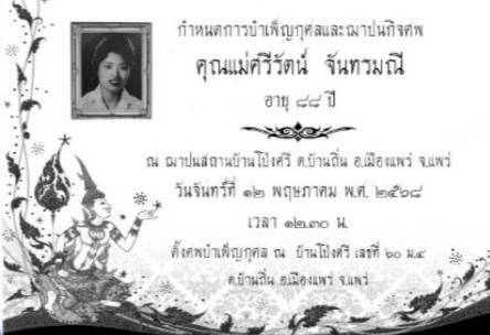 วันที่ 14 พฤษภาคม 2568 เมื่อ วันที่ 12 พฤษภาคม 2568 เวลา 13.30 น.ณ ฌาปนสถานบ้านโป่งศรี ต.บ้านถิ่น อ.เมืองแพร่ จ.แพร่ สจ.ณัฐชนนท์ พรรัตนอนันต์ ( หัวหน้าช่างติ๋ว) สจ.เขต 2 อ.เมือง จ.แพร่ ได้ประกอบบำเพ็ญกุศลศพ คุณแม่ ศรีรัตน์ จันทรมณี ซึ่งเป็นแม่ของ สจ.ณัฐชนนท์ พรรัตนอนันต์ ได้รับเกียรติจากแขกมาร่วมงานมากมาย ประกอบด้วย พล.ต.ท.ไถง ปราศจากศัตรู นางศิริวรรณ ปราศจากศัตรู รองหัวหน้าพรรค ร่วมไทยสร้างชาติ นาย อนุวัธ วงศ์วรรณ นายก องค์การบริหารส่วน จังหวัดแพร่ นายธนากร อึ้งจิตรไพศาล อดีตผู้ว่าราชการจังหวัดอุตรดิตถ์ สมาชิกสภาองค์การบริหารส่วนจังหวัด แพร่ พร้อมฝ่ายบริหาร เทศบาล ตำบล บ้านถิ่น ฝ่ายปกครอง ตำบลบ้านถิ่น แขกผู้มีเกียรติ ในพื้นที่และต่างจังหวัด มาร่วมงานและให้กำลังใจต่อ สจ.ณัฐชนนท์ พรรัตนอนันต์ และลูกหลาน ญาติพี่น้องของคุณแม่ ศรีรัตน์ จันทรมณี ผู้วายชนม์ คุณแม่ศรีรัตน์ จันทรมณี เสียชีวิต เมื่อวันที่ 8 พฤษภาคม 2568 ณ โรงพยาบาลแพร่ ญาติ ๆ จึงได้นำศพมาตั้งบำเพ็ญกุศลศพ บ้านโป่งศรี เลขที่ 60 หมู่ที่ 4 ตำบลบ้านถิ่น อำเภอเมืองแพร่ จังหวัดแพร่ สิริอายุ 88 ปี