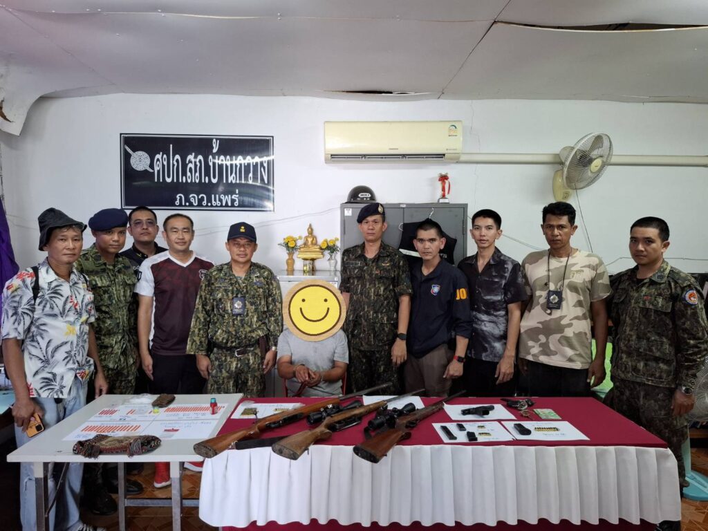 โดยการนำของ พ.ต.ท.ดิตติพงษ์ กังวานไกล สวญ.สภ.บ้านกวาง และชุดสืบสวน ทำการตรวจค้นบ้านเป้าหมายใน หมู่ที่ 2 และหมู่ที่ 4 ต.บ้านกวาง อ.สูงเม่น จ.แพร่ จากการตรวจค้นและได้ผู้ต้องหา 2 คน ผลการตรวจค้นพบยาบ้า กว่า 539 เม็ด อาวุธปืน.22 มีใบอนุญาต ปืน .22 อีก 1 กระบอกไม่มีใบอนุญาต ปืนลูกซองยาว 1กระบอก มีใบอนุญาต ปืนขนาน 9 มม.1 กระบอก พร้อมกระสุนปืนทั้ง 2 ชนิดกว่า 70 นัด ตรวจยึดรถจักรยานยนต์ 2 ค้น และรถยนต์ 1 คัน สมุดบัญชีธนาคาร 1 เล่ม จากการตรวงค้นในครั้งนี้ พบยาบ้าในห้องนอนของผู้ต้องทั้ง 2 จึงนำผู้ต้องหา ส่ง ร.ต.อ.คนอง รัตนะ รอง สว.สอบสวน สภ.บ้านกวาง จว.แพร่ เพื่อดำเนินคดีในข้อหามียาเสพติดให้โทษไว้ในครอบครอง โดยไม่ได้รับอนุญาต และมีอาวุธปืนไว้ในครอบครองโดยไม่มีใบอนุญาต จากนโยบายของกระทรวงมหาดไทย ที่ให้ทุกพื้นที่ไม่ให้มีการแพร่ระบาดของยาเสพติด (ยาบ้า ยาอี ฝิ่น เฮโรอิน ) แต่ทุกวันนี้การแพร่ระบาดของยาบ้าและสารเสพติดทุกประเภท มีการระบาดทุกพื้นที่ ตราบใดที่ผู้เกี่ยวข้องการป้องกัน และ ปราบปราม ยังมีอะไรในกอไผ่
