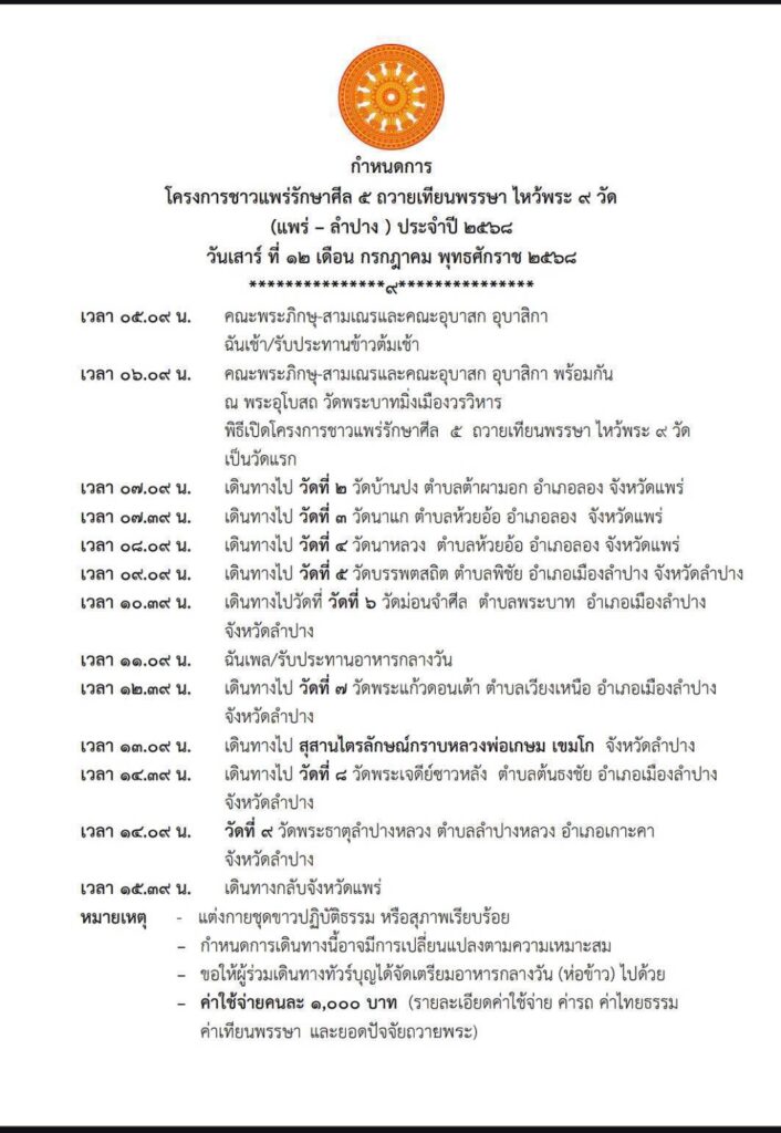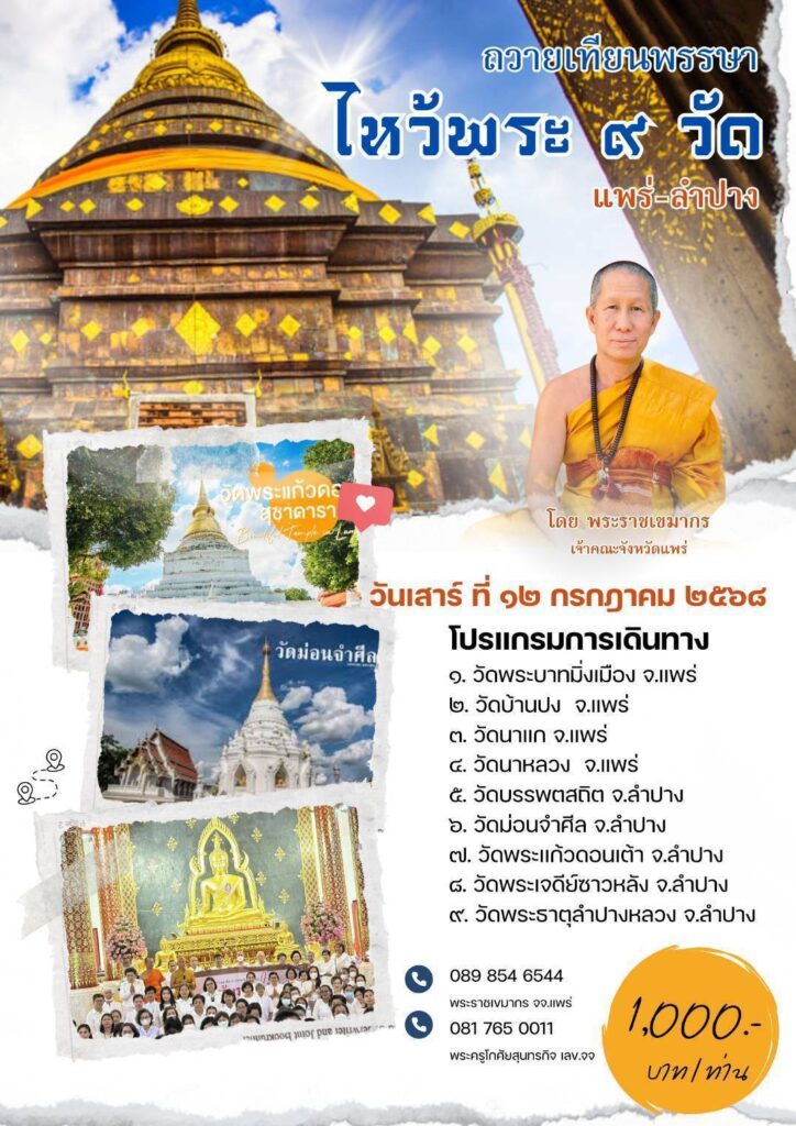 วันที่ 11 กรกฎาคม 2568 พระเทพวัชราจารย์ รศ.ดร.( ประยุตธ ภูริทตฺโต) เจ้าคณะจังหวัดแพร่ เจ้าอาวาส วัดพระบาทมิ่งเมืองวรวิหาร เจ้าอาวาสวัดป่าพุทธภูมิ ได้เจริญพร กับ บก.นสพ.ธุรกิจแพร่-ออนไลน์ ในโครงการ ถวายเทียนพรรษา ไหว้พระ 9 วัด ในจังหวัดแพร่ และจังหวัดลำปาง ในวันเสาร์ที่ 12 กรกฎาคม 2568 จึงได้เชิญชวนพระภิกษุ-สามเณร และคณะศรัทธาอุบาสก อุบาสิกา สาธุชนร่วมบุญในครั้งนี้ ตั้งแต่เวลา 06.09 น. พิธีเปิดโครงการชาวแพร่รักษาศีล 5 ถวายเทียนพรรษา ไหว้พระ 9 วัด เริ่มต้นที่ วัดพระบาทมิ่งเมืองวรวิหาร อ.เมืองแพร่ จ.แพร่ เป็นวัดแรก วัดที่2 วัดบ้านปง ต.ต้าผามอก อ.ลอง จ.แพร่ วัดที่ 3 วัดนาแก ต.ห้วยอ้อ อ.ลอง จ.แพร่ วัดที่ 4 วัดนาหลวง ต.ห้วยอ้อ อ.ลอง จ.แพร่ วัดที่ 5 วัดบรรพตสถิต ต.พิชัย อ.พระบาท จ.ลำปาง วัดที่ 6 วัดม่อนจำศีล ต.พระบาท อ.เมืองลำปาง จ.ลำปาง วัดที่ 7 วัดพระแก้วดอนเต้า ต.เวียงเหนือ อ.เมืองลำปาง จ.ลำปาง ร่วมสักการะ กราบหลวงพ่อเกษม เขมโก ณ สุสานไตรลักษณ์ วัดที่ 8 วัดพระเจดีย์ชาวหลัง ต.ต้นธงชัย อ.เมืองลำปาง จ.ลำปาง วัดที่ 9 พระธาตุลำปางหลวง ต.ลำปางหลวง อ.เกาะคา จ.ลำปาง โครงการดังกล่าวได้ปฎิบัติมากว่า 5 ปี หลังจากที่ผ่านการเข้าพรรษาของทุกปี ท่านพระเทพวัชราจารย์ จึงได้เจริญพร ให้ทุกคณะที่ร่วมเดินทางได้ยึดถือปฎิบัติเพื่อถวายเทียนพรรษา 9 วัด ไหว้พระ 9 วัด การเดินทางด้วยรถตู้จำนวน 14 คัน มีพระภิกษุ-สามเณร และคณะศรัทธา อุบาสก-อุบาสิกา สาธุชน ทุกอำเภอในจังหวัดแพร่ ร่วมโครงการ