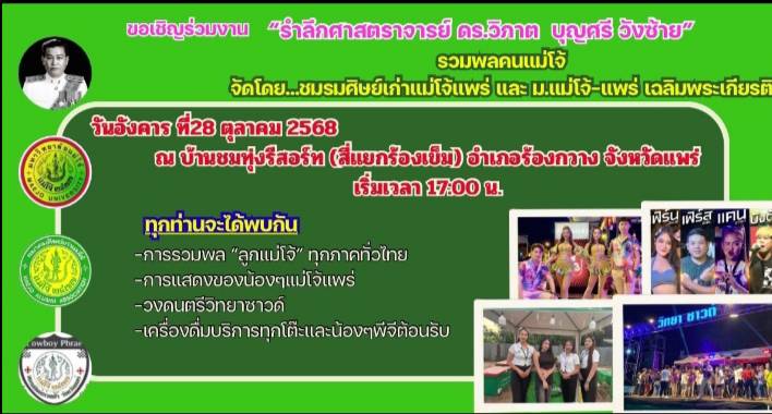 วันที่ 2 กันยายน 2568 เมื่อ วันที่ 29 สิงหาคม ที่ผ่านมา เวลา 13.30 น. ณ ห้องประชุมศาสตร์พระราชา มหาวิทยาลัยแม่โจ้-แพร่ เฉลิมพระเกียรติ ต.แม่ทราย อ.ร้องกวาง จ.แพร่ นายธีระ จันทร์แก้ว ประธานชมรมศิษย์เก่าแม่โจ้-แพร่ และคณะกรรมการชมรมฯ พร้อมที่ปรึกษาชมรมฯ ร่วมกับคณาจารย์มหาวิทยาลัยแม่โจ้- แพร่ เฉลิมพระเกียรติ ร่วมประชุมเพื่อเตรียมความพร้อมในการจัดงาน รำลึกถึง ศาสตร์จารย์ ดร.บุญศรี วังซ้าย อธิการบดีคนแรก คนต้นแบบลูกแม่โจ้มหาวิทยาลัยแม่โจ้-แพร่ เฉลิมพระเกียรติ ในปี 2568 ทางคณะผู้ดำเนินการจัดกิจกรรมงานเลื่อนมาเป็น วันอังคารที่ 28 ตุลาคม 2568 ณ รีสอร์ทกวางทอง อ.ร้องกวาง จ.แพร่ ในรูปแบบการจัดกิจกรรม รำลึกถึง ศาสตร์จารย์ ดร.วิภาค บุญศรี วังซ้าย ดังเช่นทุกปีที่ผ่านมา ช่วงเช้า รวมพลคนลูกแม่โจ้ ทั่วไทย ร่วมวางพวงมาลัย เพื่อรำลึกถึง คนต้นแบบลูกแม่โจ้ ณ อนุสาวรีย์ ศาสตร์จารย์ ดร.วิภ่าต บุญศรี วังซ้าย บริเวณ มหาวิทยาลัยแม่โจ้-แพร่ เฉลิมพระเกียรติ อ.ร้องกวาง จ.แพร่ หลังจากที่กิจกรรมน้อมรำลึกฯ วางพวงมาลัย แล้วเสร็จถือว่าสิ้นสุดภารกิจกรรมช่วงเช้า และ ในช่วงเวลา 17.00 น. ทางชมรมศิษย์เก่าแม่โจ้-แพร่ เชิญร่วมกิจกรรมรวมพลคนแม่โจ้ พบปะสังสรรค์ ย้อนรอยอดีตเมื่อครั้งยังศึกษาในถิ่นที่ให้โอกาสการเรียนรู้ และประสบการณ์กับคำว่า ลูกแม่โจ้ นำความเก่ามาเล่าสูกันฟัง นำประสบการณ์ชีวิตที่ผ่านพ้นมาพูด-คุยภาษาลูกแม่โจ้ ในโอกาสนี้ จะได้สัมผัสกับ นายกสภามหาวิทยาลัยแม่โจ้ อธิการบดีมหาวิทยาลัยแม่โจ้ นายกสมาคมศิษย์เก่าแม่โจ้ ที่สุดสำคัญพบชมรมศิษย์เก่าแม่โจ้ ภาคเหนือทุกจังหวัด ทางด้านนายธีระ จันทร์แก้ว ประธานชมรมศิษย์เก่าแม่โจ้-แพร่ ได้กล่าวถึงการจัดกิจกรรม ในปี 2568 ถือว่าจัดให้ยิ่งใหญ่ กว่าทุกปีที่ผ่านมา ภายในงาน พบการแสดงของน้องๆ ลูกแม่โจ้-แพร่ ครบเครื่องเรืองลูกแม่โจ้-แพร่ และพบกับวงดนตรี วิทยาซาวด์ พร้อมแดนเซอร์ อลังการตามแบบลูกแม่โจ้ วันอังคารที่ 28 ตุลาคม 2568 วันรำลึกถึง ศาสตร์จารย์ ดร.วิภาต บุญศรี วังซ้าย ณ บริเวณ อนุสาวรีย์ฯ มหาวิทยาลัยแม่โจ้-แพร่ เฉลิมพระเกียรติ ต.แม่ทราย อ.ร้องกวาง จ.แพร่ ศิษย์เก่าแม่โจ้ ทุกภาค สามารถติดต่อสอบถามรายละเอียดได้ที่ ประชาสัมพันธ์ชมรมฯแม่โจ้-แพร่