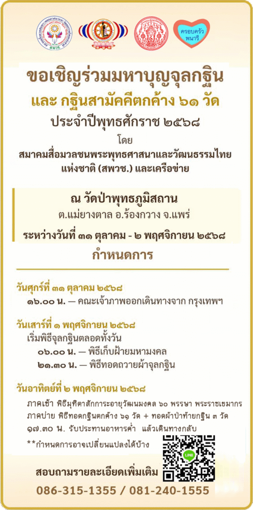 วันที่ 13 กันยายน 2568 ด้วยทาง สมาคมสื่อมวลชนพระพุทธศาสนาและวัฒนธรรมไทย แห่งชาติ ( สพวช.) และครือข่าย เชิญร่วมมหาบุญจุลกฐิน และกฐินสามัคคีตกค้าง 61 วัด ประจำปี 2568 ทอด ณ วัดป่าพุทธภูมิสถาน ตำบลแม่ยางตาล อำเภอร้องกวาง จังหวัดแพร่ ในวันที่ 1-2 พฤศจิกายน 2568 จากกรณี ที่ทางวัดป่าพุทธภูมิสถาน หลังจากได้กำหนดพิธีปลูกต้นฝ้าย เมื่อวันที่ 20 มิถุนายน 2568 ณ บริเวณ วัดป่าพุทธภูมิสถาน โดยมี นายสมชัย เลิศประสิทธิพันธ์ ผวจ.แพร่ ประธานฝ่ายฆราวาส พระเดช พระคุณ ท่านเจ้าคุณ พระราชเขมากร รศ.ดร. เจ้าคณะจังหวัดแพร่ เจ้าอาวาสวัดพระบาทมิ่งเมืองวรวิหาร เจ้าอาวัดป่าพุทธภูมิสถาน ในวันและเวลาดังกล่าว ทางสมาคมสื่อมวลชนพระพุทธศาสนาและวัฒนธรรมไทยแห่งชาติ ( สพวช.) และเครือข่าย จึงได้เชิญชวน สาธุชนคณะศรัทธาที่มีจิตใจเป็นบุญกุศล ร่วมงาน มหาบุญจุลกฐิน และกฐินสามัคคีตกค้าง 61 วัด ในจังหวัดแพร่ เพื่อเป็นการทะนุบำรุงพระพุทธศาสนาให้สืบสานต่อไป เพื่อซึ่งไว้ประเพณีอันดีงามมาตั้งแต่บรรพบุรุษและให้อนุชนคนรุ่นหลังได้เข้าถึงในคำ สอนขององค์สมเด็จพระสัมมาสัมพุทธเจ้า ในวันที่ 1-2 พฤศจิกายน 2568 ณ วัดป่าพุทธภูมิสถาน ต.แม่ยางตาล อ.ร้องกวาง จ.แพร่