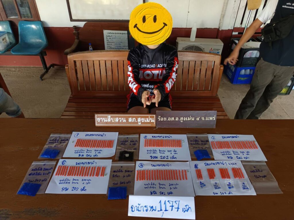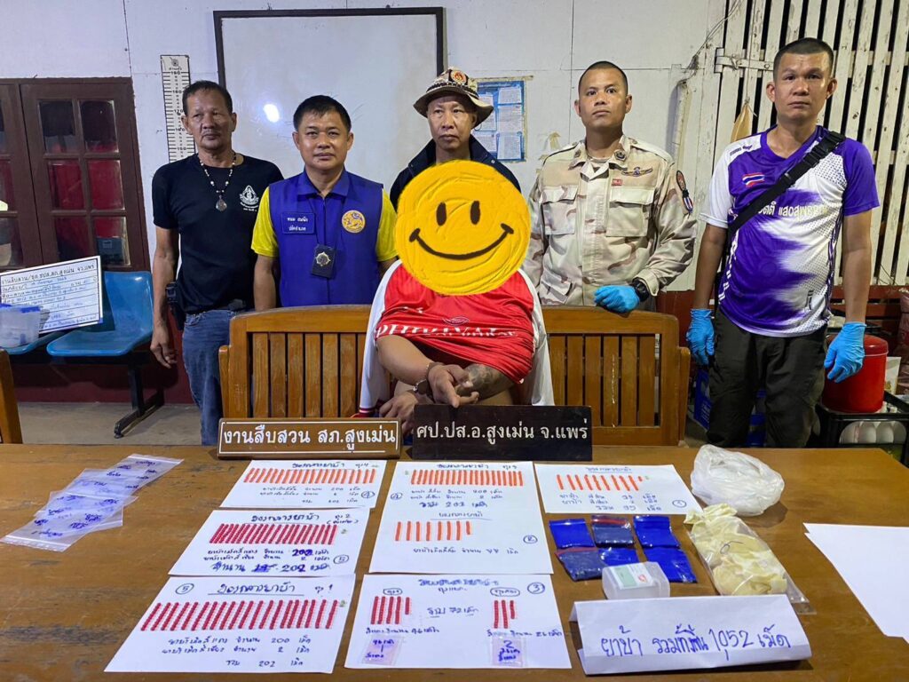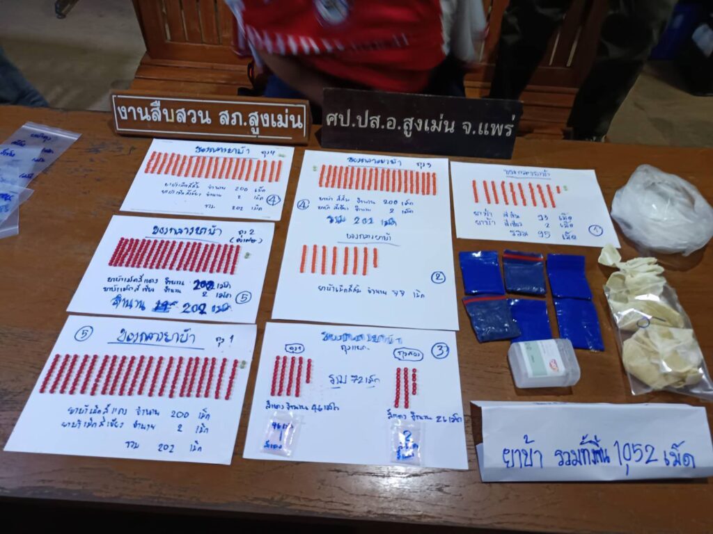 ได้รับการแจ้งข่าวจากสายในพื้นที่ ต.หัวฝาย อ.สูงเม่น จ.แพร่ ในบ้าน เลขที่ 93 หมู่ที่ 6 ต.หัวฝาย อ.สูงเม่น จ.แพร่ มีการค้ายาบ้า จึงได้วางแผนเข้าตรวจค้น โดยมีฝ่ายกำนัน และผู้ใหญ่บ้านในพื้นที่ร่วมการตรวจค้น ภายในห้องนอน ของ น.ส.จิรประภา หรือ เอฟ อายุ 34 ปี พบสิ่งของต้องสงสัยจึงนำออกมาตรวจสอบพบยาบ้า จำนวน 1,177 เม็ด พร้อมกับขยายผลที่มาของยาบ้าดังกล่าว ในเวลา 16.30 น.ได้เดินทางไปยัง ต.เวียงทอง อ.สูงเม่น จ.แพร่ เข้าทำการตรวจค้น บ้านเลขที่ 50/4 หมู่ที่ 6 ต.เวียงทอง อ.สูงเม่น จ.แพร่ ทำการจับกุม นายภานุเมธ หรือ มิ้ว อายุ 41 ปี ตรวจค้นห้องนอนพบกระเปาสีส้ม ภายในพบหอกระดาษสีส้มพันด้วยสก๊อตเทปใส จึงทำการเปิดดูพบ ยาบ้า จำนวน 1,052 เม็ด รวมยาบ้ากว่า 2,229 เม็ด