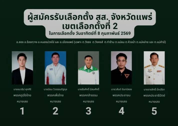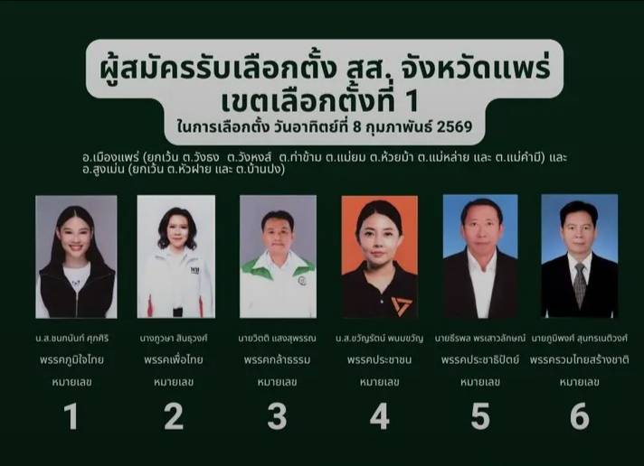 วันที่ 5 มกราคม 2569 บทวิเคราะห์การเมืองระดับประเทศ ในพื้นที่ จ.แพร่ ในปี 2569 ถือว่าเป็นปีแห่งการเลือกตั้ง ตั้งแต่ระดับ ท้องถิ่น การเลือกตั้งระดับท้องถิ่น เลือก นายก อบต.และ ส.อบต. ในวันอาทิตย์ที่ 11 มกราคม 2569 ช่วงนี้ถือว่าเป็นโค้งสุดท้ายของการหาเสียง จังหวัดแพร่ มี อบต.ทั้งสิ้น 66 แห่ง มี 12 แห่งที่จะต้องรอการประเมินการแบ่งเขต ทาง กกต. คาดการจะมีการเลือกตั้งประมาณเดือนเมษายน 2569 วกมาที่การเมืองระดับประเทศ จังหวัดแพร่ มีพรรคการเมือง ประกอบด้วย พรรค ภูมิใจไทย พรรคกล้าธรรม พรรค ร่วมไทยสร้างชาติ พรรค เพื่อไทย พรรค ประชาชน พรรค ประชาธิปัตย์ และพรรคพลังประชารัฐ พรรคการเมืองทั้งประเทศ มี 76 พรรค จังหวัดแพร่ มี 3 เขต ประกอบด้วย เขต 1 เบอร์ 1 น.ส.ชนกนันท์ ศุภศิริ พรรค ภูมิใจไทย เบอร์2 นางภูวษา สินธุวงศ์ พรรค เพื่อไทย เบอร์ 3 นายวิตติ แสงสุพรรณ พรรค กล้าธรรม เบอร์ 4 น.ส.ขวัญรัตน์ พนมขวัญ พรรค ประชาชน เบอร์ 5 นายธีระพล พรเสาวลักษณ์ พรรค ปชป. นายภูมิพงศ์ สุนทรเนติวงศ์ พรรค ร่วมไทยสร้างชาติ