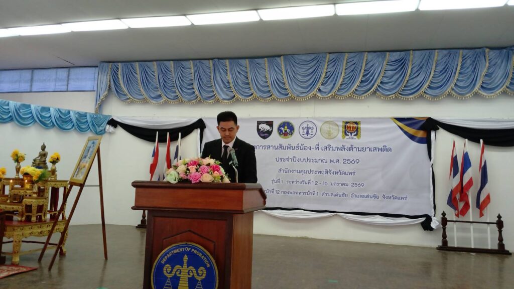 เปิดโครงการ สานสัมพันธ์ น้อง-พี่ เสริมพลังต้านยาเสพติด รุ่นที่ 1 ปีงบประมาณ 2569 โดย นายโชคชัย บุญชูช่วย ผู้อำนวยการสำนักงานคุมประพฤติ จังหวัดแพร่ กล่าวรายงานและต้อนรับพร้อมด้วย อาสาสมัครคุมประพฤติ กระทรวงยุติธรรม จังหวัดแพร่ คณะวิทยากร ด้านสาธารณสุข เจ้าหน้าที่ตำรวจ จังหวัดแพร่