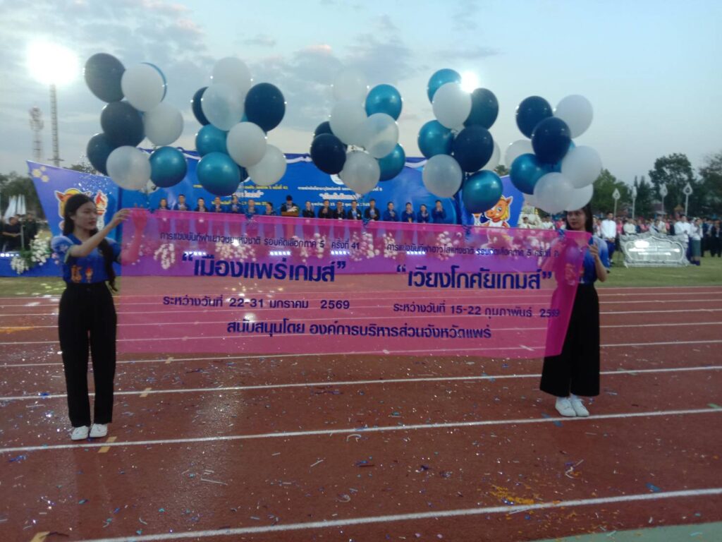 วันที่ 23 มกราคม 2569 เมื่อ วันที่ 22 มกราคม 2569 เวลา 17.30 น. ณ สนามกีฬากลาง อบจ.แพร่ อ.เมืองแพร่ จ.แพร่ นายสมชัย เลิศประสิทธิพันธ์ ผวจ.แพร่ ประธานเปิดการแข่งขันกีฬาเยาวชน แห่งชาติ รอบคัดเลือกครั้งที่ 41 ภาค 5 เมืองแพร่เกมส์