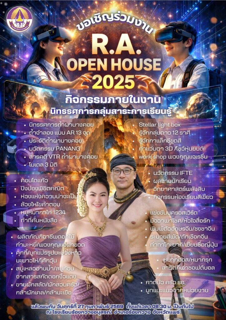 วันที่ 26 กุมภาพันธ์ 2569 โรงเรียน ร้องกวางอนุสรณ์ อำเภอร้องกวาง จังหวัดแพร่ เชิญร่วมงาน R.A. OPEN HOUSE 2025 ในวันศุกร์ที่ 27 กุมภาพันธ์ 2569 ณ โรงเรียนร้องกวางอนุสรณ์ เริ่มตั้งแต่เวลา 08.30 น.เป็นต้นไป มีกิจกรรมในงาน ชมนิทรรศการกลุ่มงานสาระการเรียนรู้มากมายในยุค โซเซียลมีเดีย สื่อสารไร้พรมแดน………………………..โดย คณะครูด้านวิชาการ กลุ่มสาระการเรียนรู้ ที่นำพาสิ่งที่เกิดขึ้นในปัจจุบันและอนาคต เช่น นิทรรศการถ้ำผานางคอย แบบ AR.โมเดล 3 มิติ ปิงปองพิชิตคณิต ชมสัมผัสผลิตภัณฑ์อาชีพดอกไม้จากนักเรียน ชม Stellar light Box ทำแว่นตา 3 D และโชว์หุ่นยนต์ นวัตกรรม IFTE. แข่งขันนครอสเวิร์ค และกาดมั่ว ครัวแลง พร้อมบูธแนะแนวจากหน่วยงานต่างๆใน อำเภอร้องกวาง วันศุกร์ที่ 27 กุมภาพันธ์ 2569 เวลา 08.30 น.พบกันที่ โรงเรียนร้องกวางอนุสรณ์ อำเภอร้องกวาง จังหวัดแพร่
