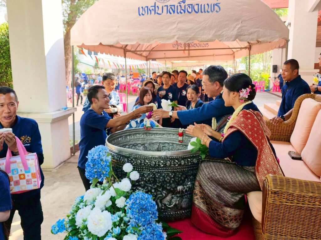 ***จังหวัดแพร่ จัดพิธีรดน้ำดำหัวผู้ว่าราชการจังหวัด สืบสาน “ป๋าเวณีปี๋ใหม่เมือง” ประจำปี 2569 อย่างอบอุ่น ***วันที่ 16 เมษายน 2569 นายคุณากร คชหิรัญ และนายชัยสิทธิ์ ชัยสัมฤทธิ์ผล รองผู้ว่าราชการจังหวัดแพร่ ร่วมกับหัวหน้าหน่วยงานภาครัฐ ภาคเอกชน นายอำเภอจากทุกอำเภอในจังหวัด ผู้บริหารองค์กรปกครองส่วนท้องถิ่น ข้าราชการ พนักงาน และประชาชนทั่วไป ร่วมนำขบวนแห่น้ำขมิ้นส้มป่อยและเครื่องดำหัว มายังจวนผู้ว่าราชการจังหวัดแพร่ อำเภอเมือง จังหวัดแพร่ เพื่อแสดงความเคารพและร่วมพิธีรดน้ำดำหัวผู้ว่าราชการจังหวัดแพร่ เพื่อสืบสานประเพณีอันดีงาม “ป๋าเวณีปี๋ใหม่เมือง” หรืองานประเพณีสงกรานต์ตามแบบล้านนา ซึ่งถือเป็นวัฒนธรรมที่มีความสำคัญและยึดถือกันมายาวนานในภาคเหนือ***ในพิธีผู้ร่วมงานต่างพร้อมใจกันกล่าวคำ “ขอสุมมา” หรือคำขอขมาขอพรต่อผู้ใหญ่ตามธรรมเนียมล้านนา โดยมีนายสมชัย เลิศประสิทธิพันธ์ ผู้ว่าราชการจังหวัดแพร่ และนางสาวฐิติมา สุภาพันธ์ นายกเหล่ากาชาดจังหวัดแพร่ เป็นผู้รับรดน้ำดำหัว แสดงถึงความกตัญญูและความนอบน้อมของประชาชนที่มีต่อผู้ใหญ่ในสังคม พิธีรดน้ำดำหัวใช้ “น้ำขมิ้นส้มป่อย” ซึ่งเป็นน้ำมงคลตามประเพณีล้านนาในการประกอบพิธี ท่ามกลางบรรยากาศอันอบอุ่น และงดงาม